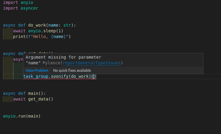 Now, because of the way Asyncer is designed, you will get typing support for your code.